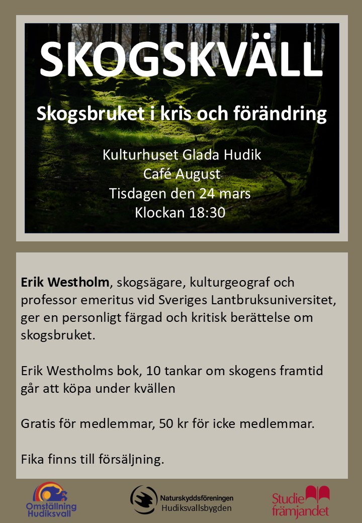 Varmt välkommen till en skogskväll då självaste Erik Westholm talar. Gratis för medlemmar! Ett samarrangemang med Omställning Hudiksvall och Studiefrämjandet!